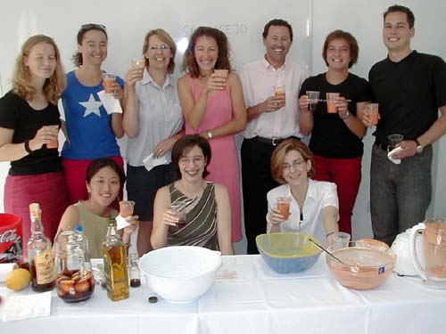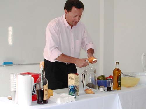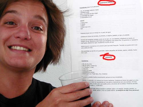 Cooking with PedroSeville, May 2002Cooking course at LINC language school. ![]() 4:40 pm: Pedro, the Director of the school, cuts pieces of fruit for the sangria. ![]() 4:40 pm: Gazpacho and sangria are the two recipes in today’s class. ![]() 5:30 pm: Smiles all around as it comes time to taste the final product. Close Window |