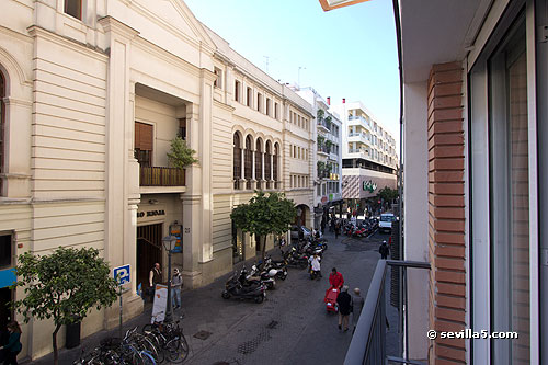 View from the balcony towards Plaza Magdalena. There is no car traffic, because calle Rioja is pedestrian.