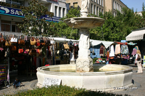 View towards Plaza de la Magdalena with its mercadillo. Rioja street, together with Tetuán and Sierpes streets, is the main shopping district in the center of Seville.