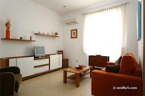Comfortable and air-conditioned living-room. In addition to the coffee table, there is a higher, foldable table, next to the window.
