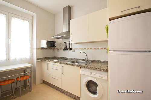 Kitchen with washing machine, stove-top, microwave, fridge, toaster, coffee machine, and most important cooking utensils. There is an extensible eating table.