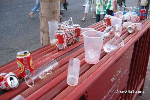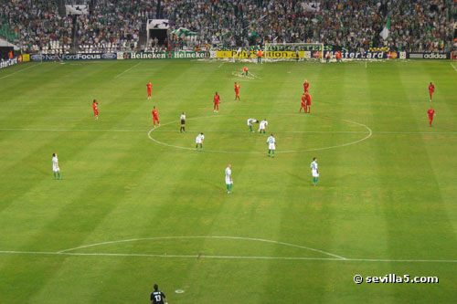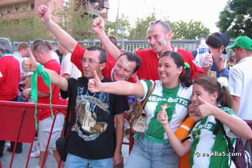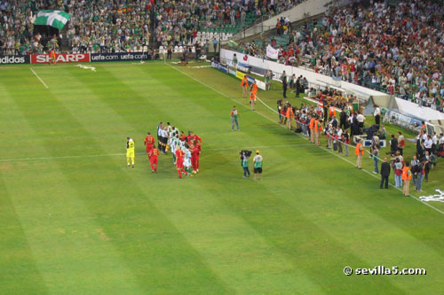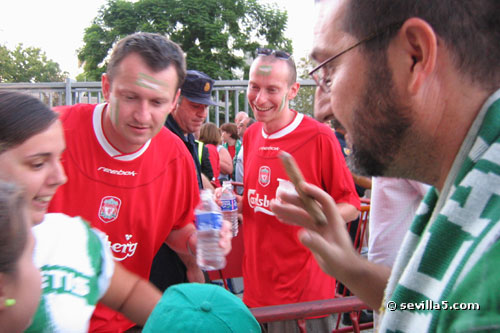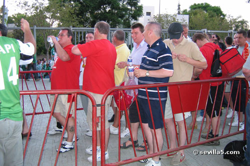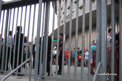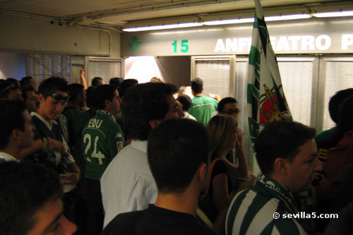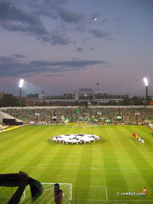 For the first time ever, the Champion's League comes to Seville. Real Betis classified for the European competition last season, and played their first match against last year's champion, Liverpool. The fans from Liverpool were in town to see their team narrowly escape with a victory. Result: Betis 1 - Liverpool 2. ![]() A police presence and gates helped protect the Liverpool fans before the match, but was it necessary? ![]() Some Betis fans have made their way around to the Liverpool queue. There seems to be some sort of heated discussion going on! ![]() All is ok! The match hasn't started yet so things are very friendly between the two groups of fans. ![]() It's time for the pre-match conversations to end and enter the stadium. ![]() It's also time to finish your beer! No alcohol is allowed in the stadium as you can see by the trash left here. ![]() Only five minutes until the start, so we push our way through the gates. ![]() View from the North Goal just before the match. ![]() The teams shake hands and the crowd is anticipating a good match. ![]() Match time! Close Window |