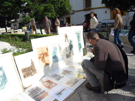 An outdoor market in the Plaza del Duque with bags, clothing, jewelry and crafts for sale.