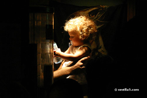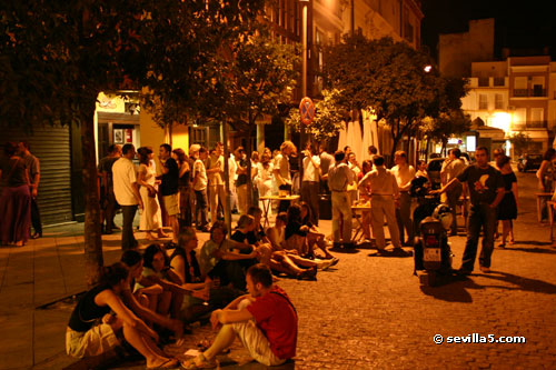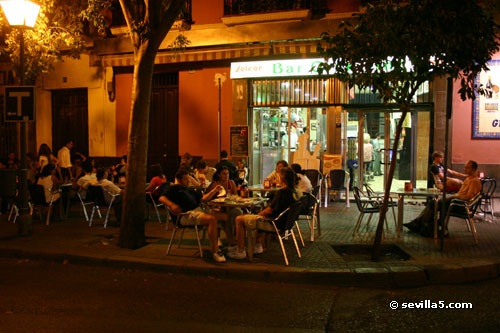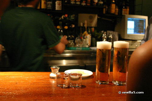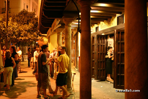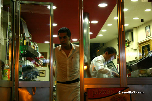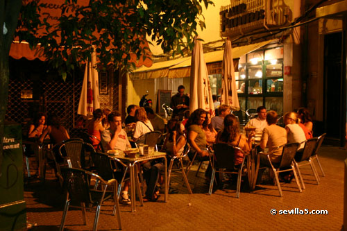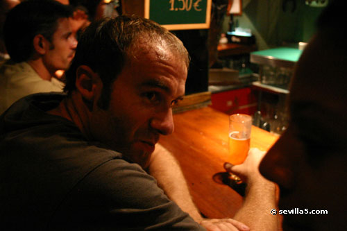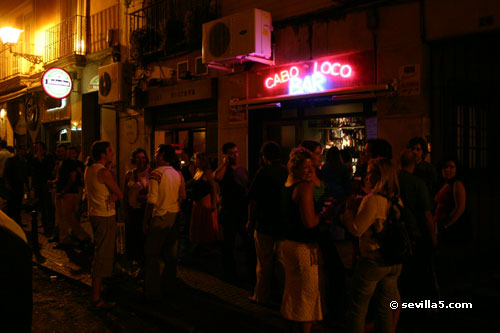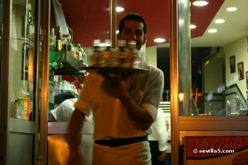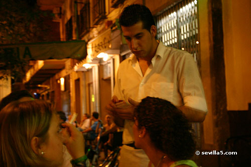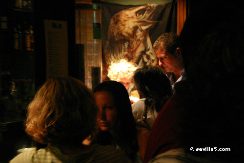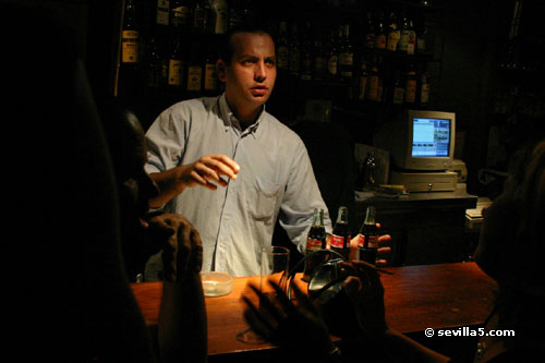 ![]() Around Plaza AlfalfaSevilla, 30 July 2005Nightlife in and around Plaza Alfalfa. ![]() We start our tour at Plaza del Salvador, which is the square in front of Salvador church, the second largest church in Seville after the Cathedral. ![]() The marble columns at bar La Antigua Bodeguita. This is a good bar to start the evening in, plenty of cold beer to drink in the plaza outside. ![]() Inside the bar: wood panels, jamón and bottles of wine. ![]() We go around Iglesia del Salvador, up the street Cuesta del Rosario and pass by Café/Bar Universal. ![]() Reaching El Gran Tino at Plaza Alfalfa. This El Gran Tino and Bar Manolo, just opposite, are good places for tapas during the day or night. ![]() Sebastián has seen us. He is one of waiters at bar El Gran Tino. ![]() Taking the orders for drinks and tapas. ![]() Very fast and friendly service, combined with Argentinean charm. ![]() We recommend after dinner drinks on calle Perez Galdos, just off Plaza Alfalfa, with one of the highest concentration of bars in Seville. ![]() The owner of the bar El Cabo Loco. ![]() Shots, or chupitos and beers. Yes, this is a bar de copas. ![]() After 40 emails and several tequilas. ![]() What's there at the back of the bar? A very small person getting a drink. ![]() Only a bottle of water, menos mal. Close Window |