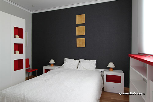 Bedroom with a double bed and a large wardrobe.