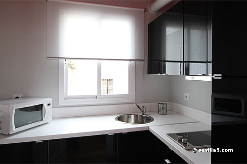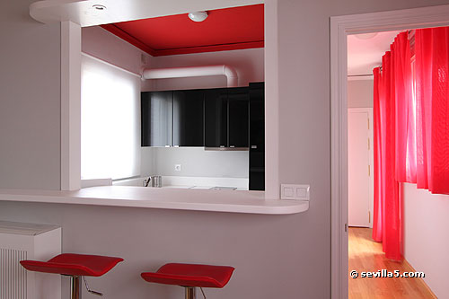 The kitchen is in a separate room, but has a window to the living-room (to the left, not shown on the photo).