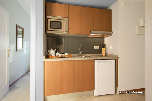 The kitchenette, small but well equipped for self-catering, is just by the apartment entrance.