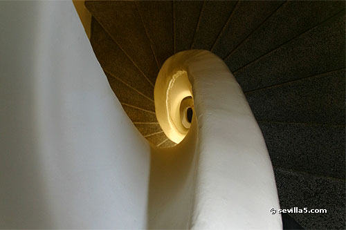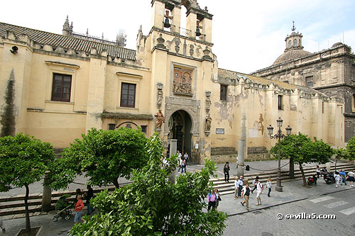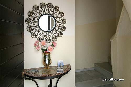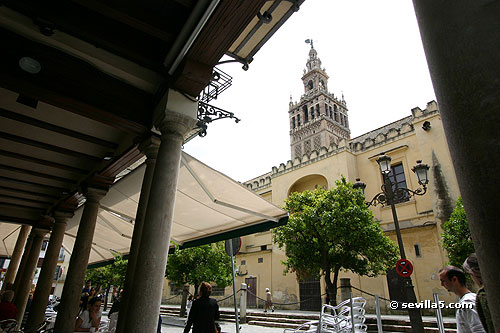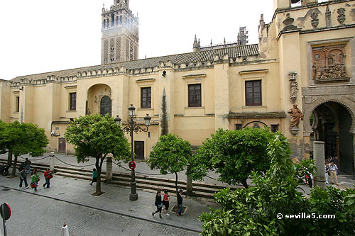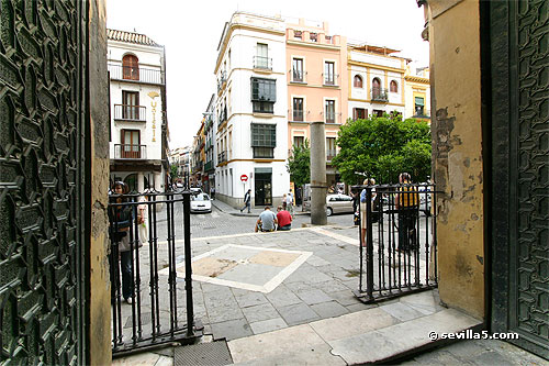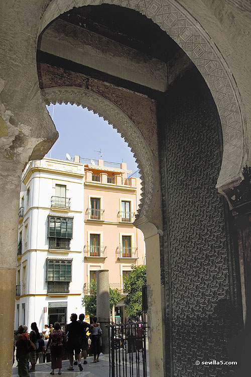 View from The Patio de Naranjos through the Puerta del Perdón on the apartment building on Alemanes street Nr. 15.