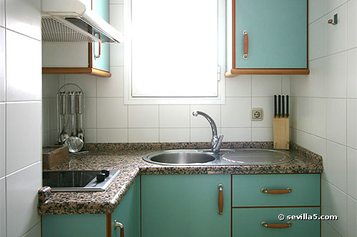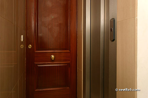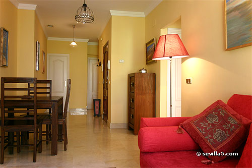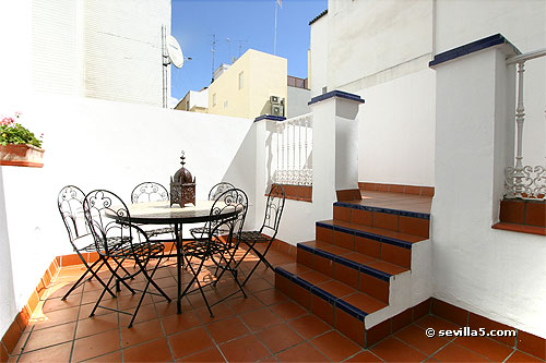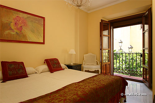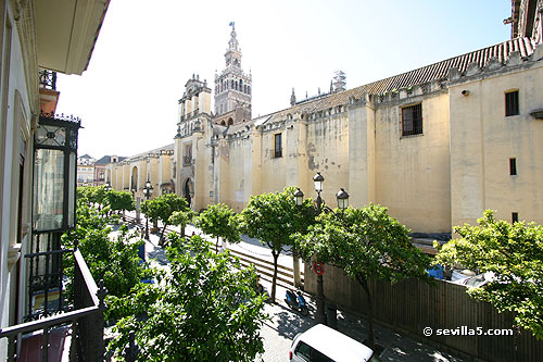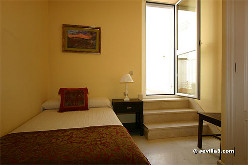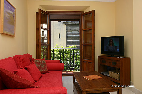 Living room with sofa-bed and private patio that opens to the Cathedral, which is directly across the street.