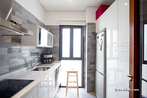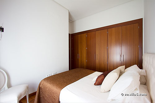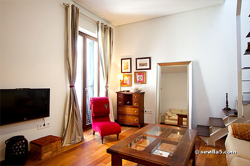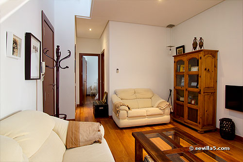 Living room with two sofas. The corridor beyond leads to the bedroom.