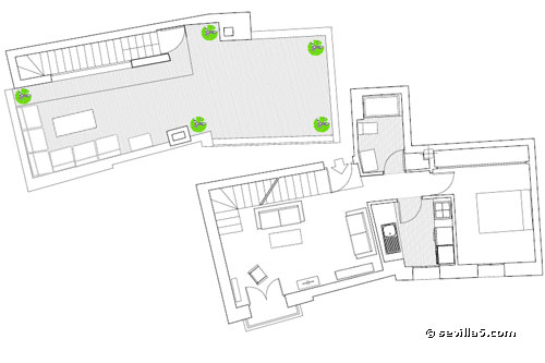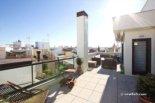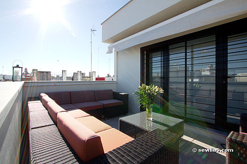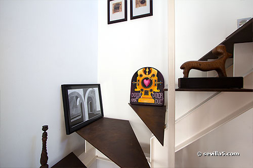 Outdoor seating and windows towards the staircase, which connects to the living room.