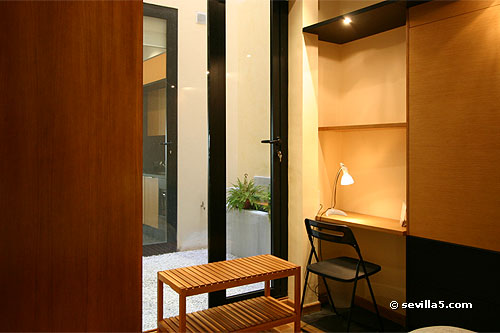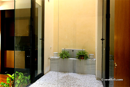 View from the living room to the bedroom. In the middle you can see the small courtyard with fountain. At night, you can cover the glass with curtains, which roll into the ceiling.