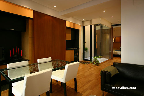 The kitchen area is on the right, behind a sliding wood panel. Appliances include a dish-washer, oven, microwave, etc. In the background a large dining table and two windows to Garcia Vinuesa street.
