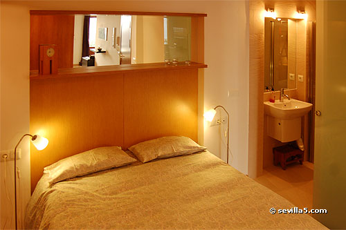 Bedroom with double bed. The bathroom is equipped with a shower.