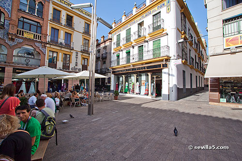 View from Plaza del Pan towards the apartment building, with a shop for Flamenco dresses on the ground floor. The tables belong to the Bar Europa.