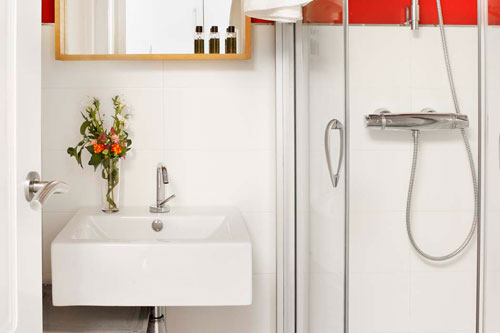 Bathroom with toilet, wash basin and shower.