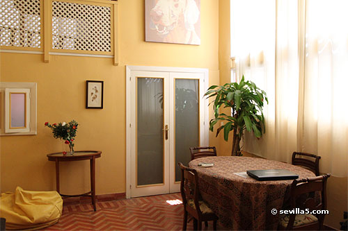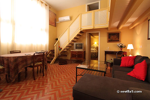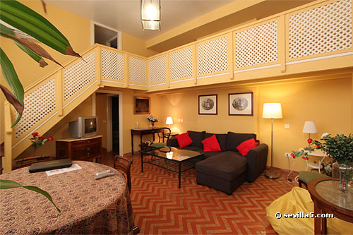 Entrance to the living room. You can see the two levels of the apartment. There is a double bedroom on the lower level and a twin bedroom on the upper level. Apartment size approx. 90 sqm.
