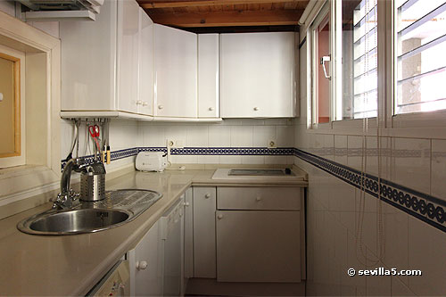 The kitchen, which has access from the hall, in front of the living room. The kitchen is competelly equipped with a glass-ceramic stove-top, washing machine, dishwasher, fridge, oven and microwave.