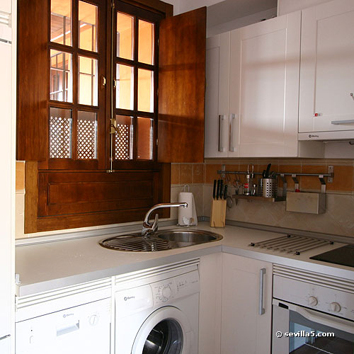 The kitchenette is open onto the living room, and is well equipped with oven and washing machine. The window faces the central patio.