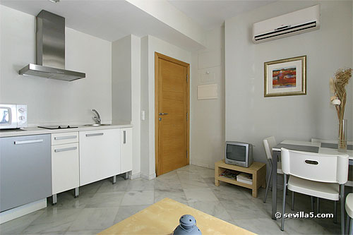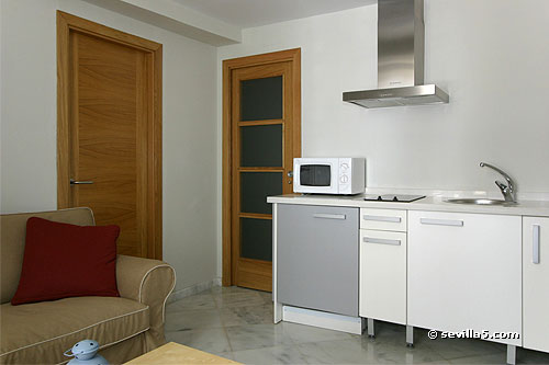 Kitchenette and bedroom and bathroom door.