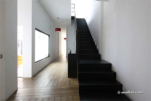 Entrance to the Pedro Terrace building with central stairway. All construction materials are, whenever possible, in its original surfaces. E.g., wood and steel without paint.