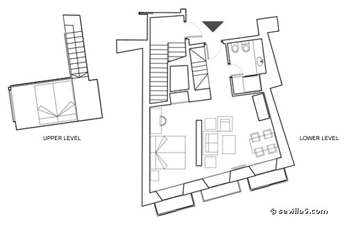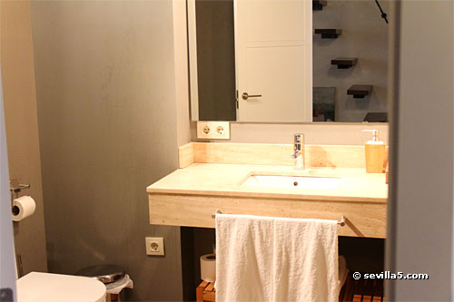 Opposite to the stairway is the bathroom with washbasin, toilet and shower.