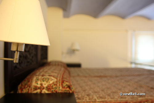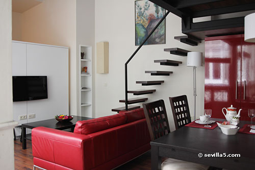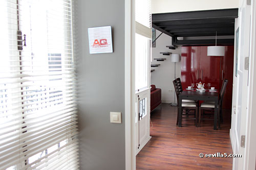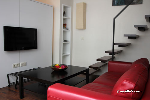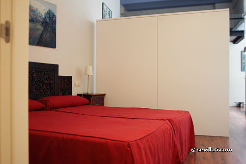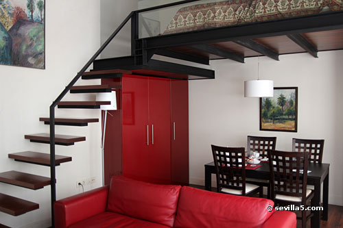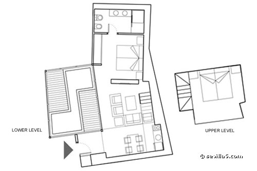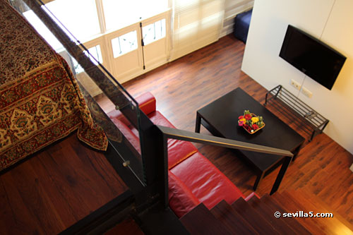 View from the upper level. The white plataform below separates the living area to the main bedroom.