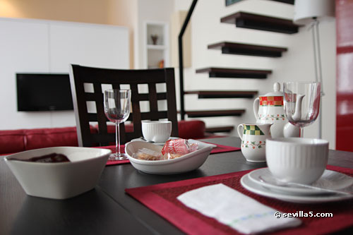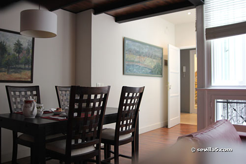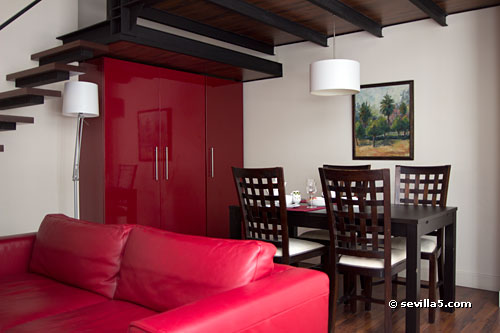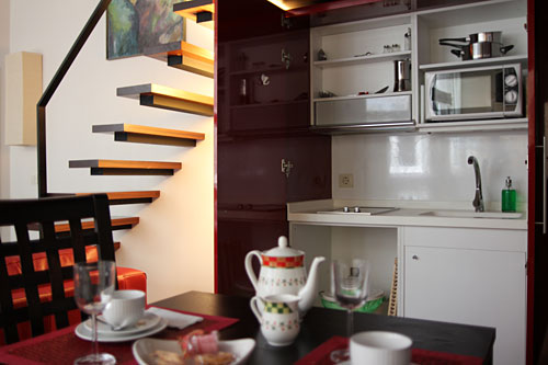 View towards the dining table. On the left (behind the stairs) is a cupboard kitchen.