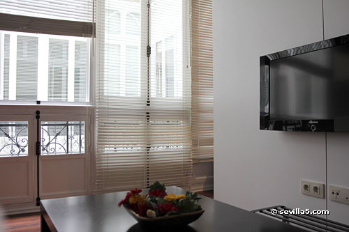 Living area with dining table, sofa, coffee table and flat screen TV.