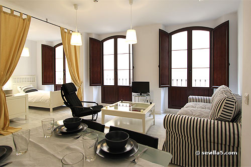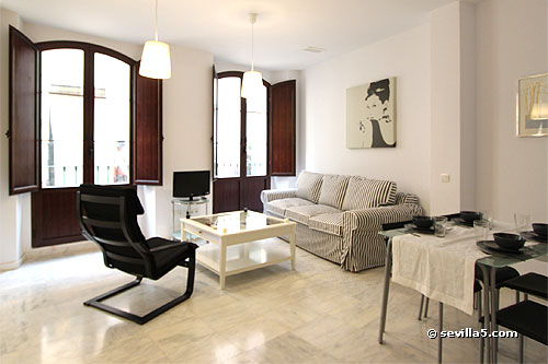 There is a double sofa-bed, TV and a dining table with four chairs. This is a large apartment with 88 sqm.