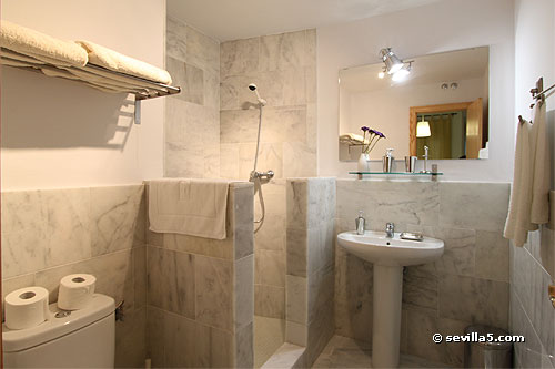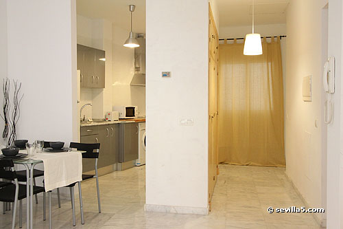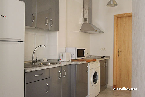 There is a washing machine, stove-top, microwave, coffee maker, and all the important kitchen utensils for self-catering. At the end you can see the door to one of the two bathrooms.