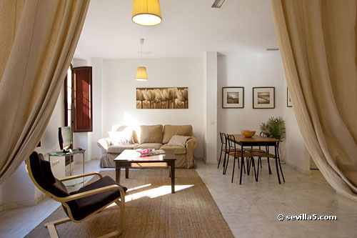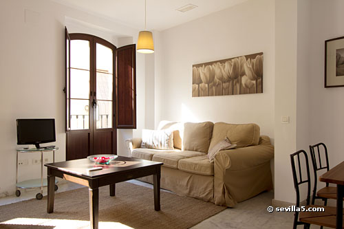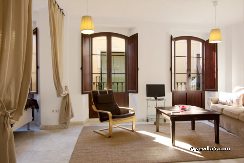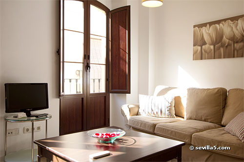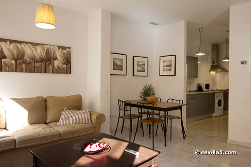 There is a double sofa-bed, TV and a dining table with four chairs. This is a large apartment with 88 sqm.