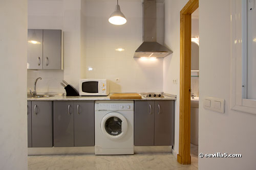 View to the back of the house. The kichen is equipped with a washing machine, stove-top, microwave, coffee maker, and all the important kitchen utensils for self-catering.
