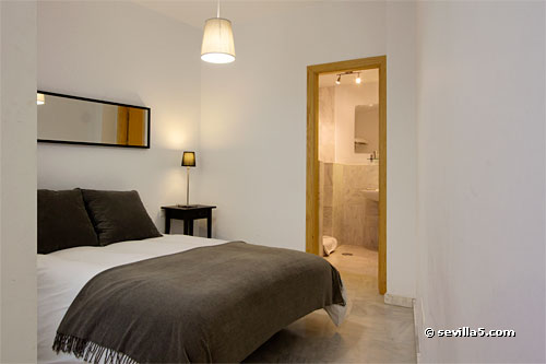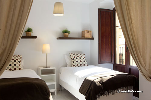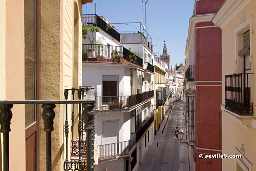 Views on Quirós street from the bedroom window. The tower bell of the Cathedral (La Giralda) is on the background. There is very little car traffic on the street. Only residents take the street by car.