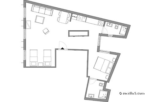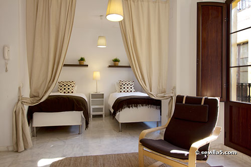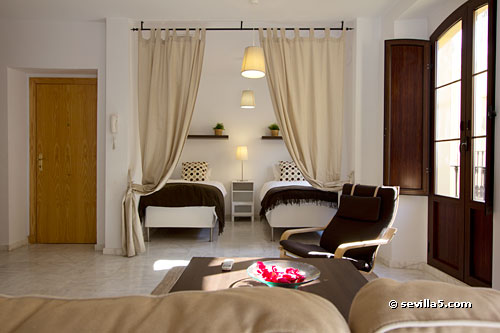 Next to the living is a sleeping area, separated by a curtain, with two twin beds of 90x200cm.
