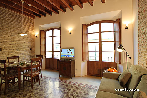 The living room is equipped with a large dining table, flatscreen tv, and sofa. Two french balconies open to Relator street.