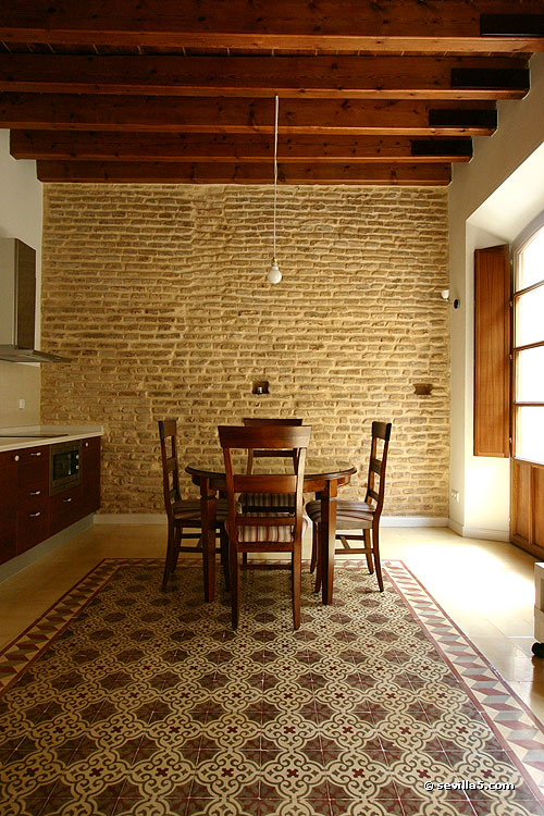 The mosaic tile floor and the wood beam ceiling have been preserved.