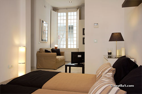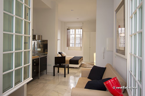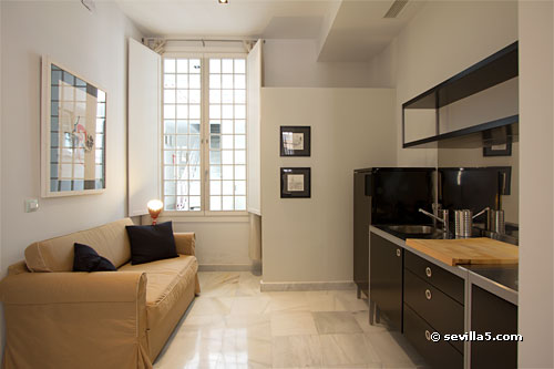 Living area and kitchen share the same space. The window faces the interior patio of the house.