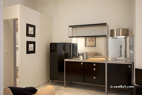 The kitchen is small but well equipped for self-catering. On the left is the access to the bathroom.