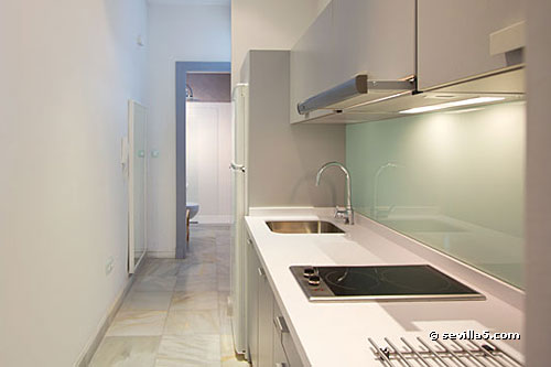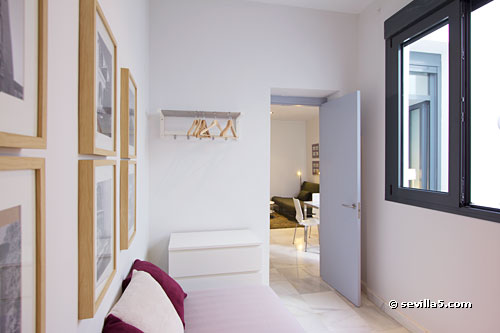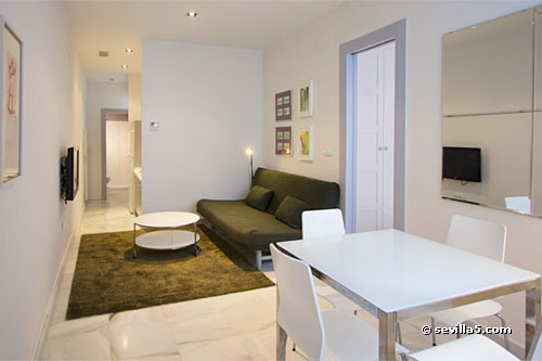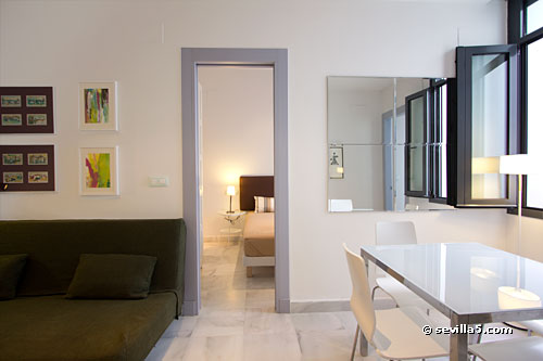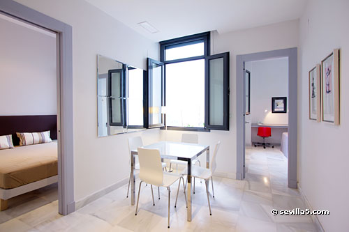Dining space with table and chairs. The right door opens to the second bedroom.