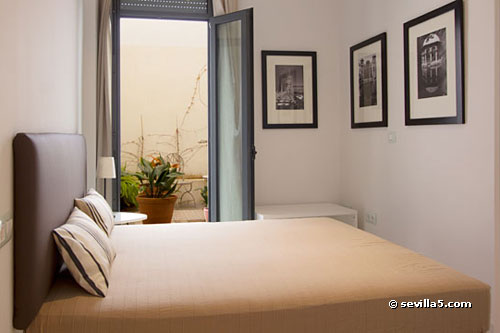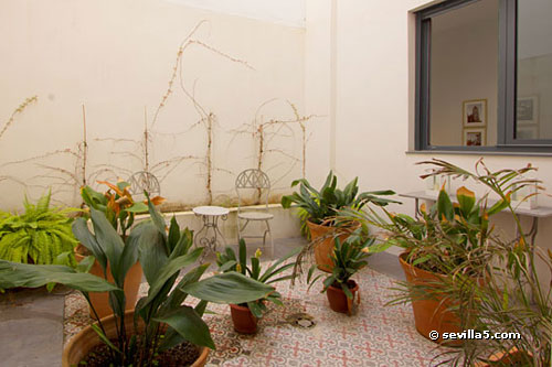 Private patio with plants. The window on the right belongs to the second bedroom.
