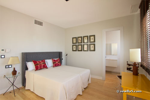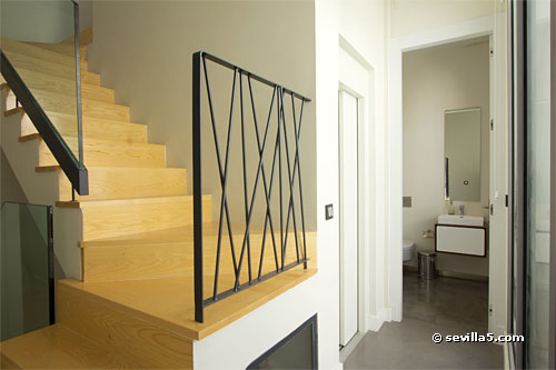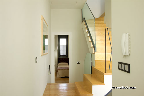 View towards bedroom 2. Stairs lead up to the upper level, where is located the third bedroom and terrace.