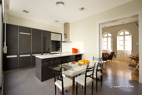 Dining room with table and chairs for 6. The modern kitchen is equipped with the main utensils and appliances for self-catering. On the right is the living room.