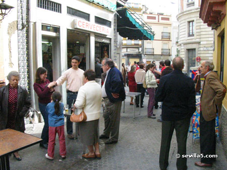 Making our way back around the church we find El Tremendo, a very small bar which serves beer, wine and snacks. People of all ages spill into the pedestrian street in what is one of Seville's most popular "cervecerias".