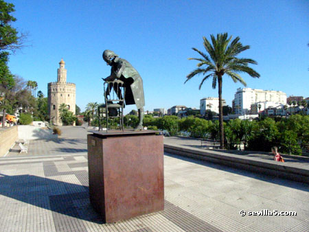 river walk along the Rio Guadalquivir. Here we see a statue with the Torre del Oro in the background.
